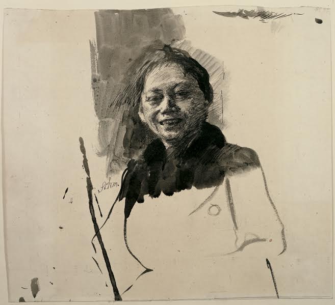 Кете Кольвиц, «Автопортрет, смеющаяся». Рисунок, тушь, перо, 1888/89