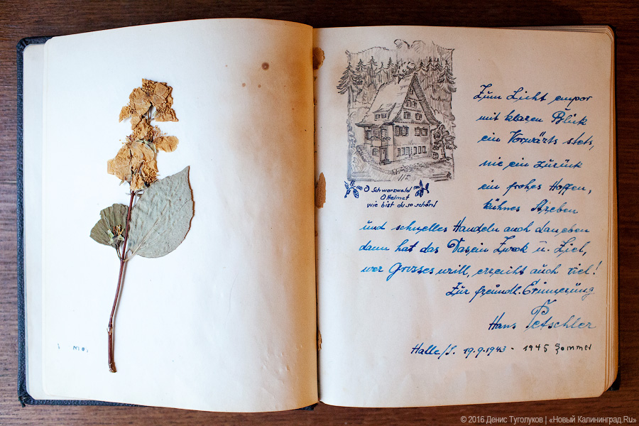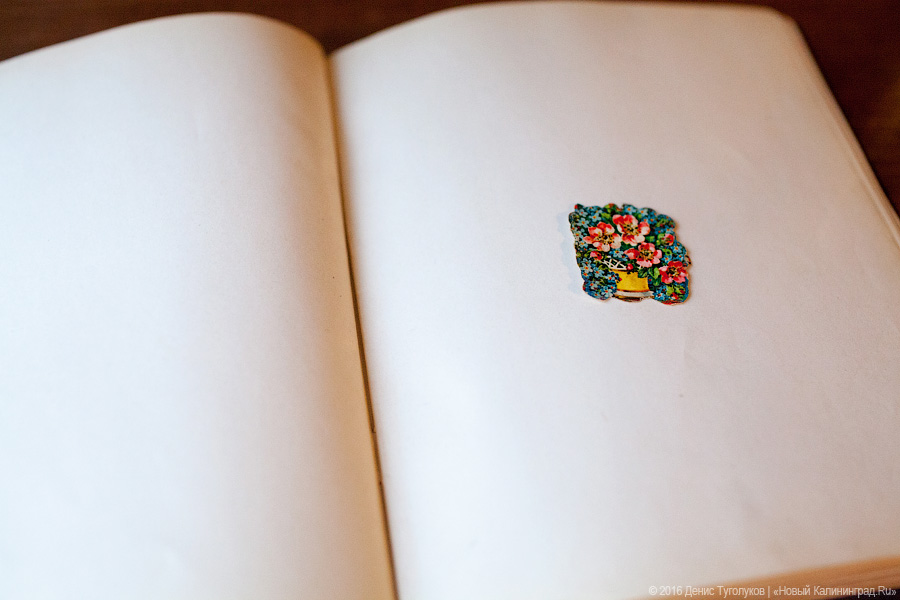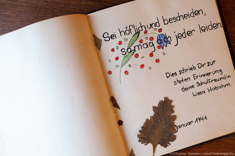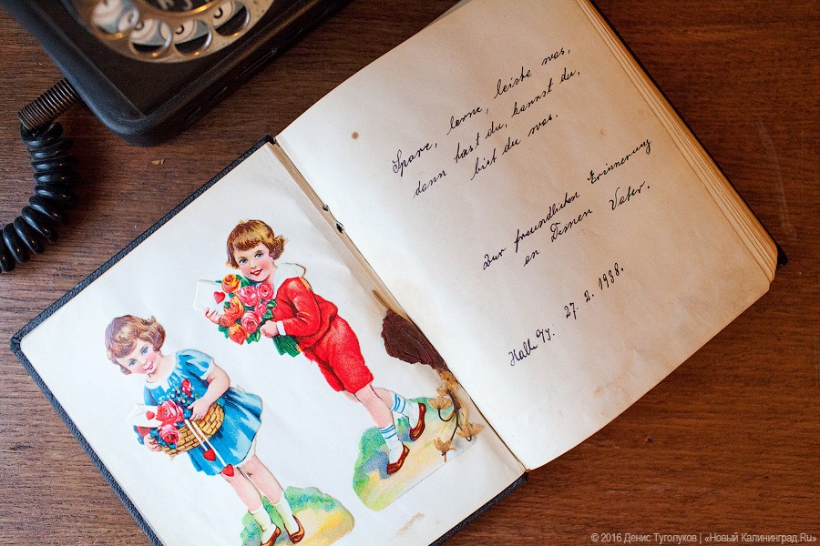 — Этот альбом для памятных записей девочке Эрне подарил отец 27 февраля 1938 года. Кем он был и как точно его звали, неизвестно, но на первой странице альбома он оставил дарственную надпись: «Экономь, учись, добивайся — тогда ты будешь иметь, будешь знать и