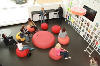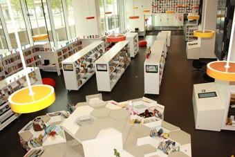 Найти любую интересующую книгу можно с помощью расположенных на стеллажах компьютеров. Периодические издания можно прочесть на iPad. Зал с данными изданиями заполнили яркими пятнами на стенах в виде обложек журналов, рисунков детей, телевизора, а также креслами на полу для того, чтобы проходящие мимо старшеклассники увидели все это через окно и захотели войти.