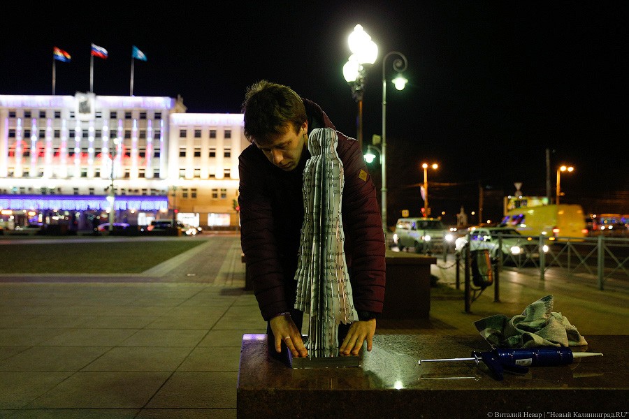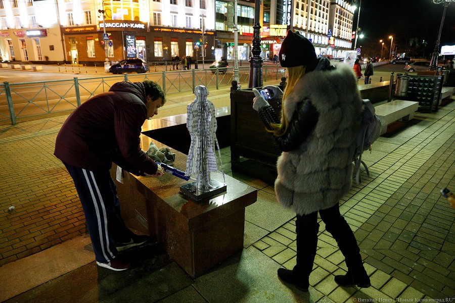Инициатором ее появления в областном центре стал уже местный бизнесмен — Александр Макатаев. Скульптуру приклеили на гранитный парапет недалеко от мэрии, которая своего разрешения на происходящее явно не давала — так что процесс потянул еще и на перфоманс.