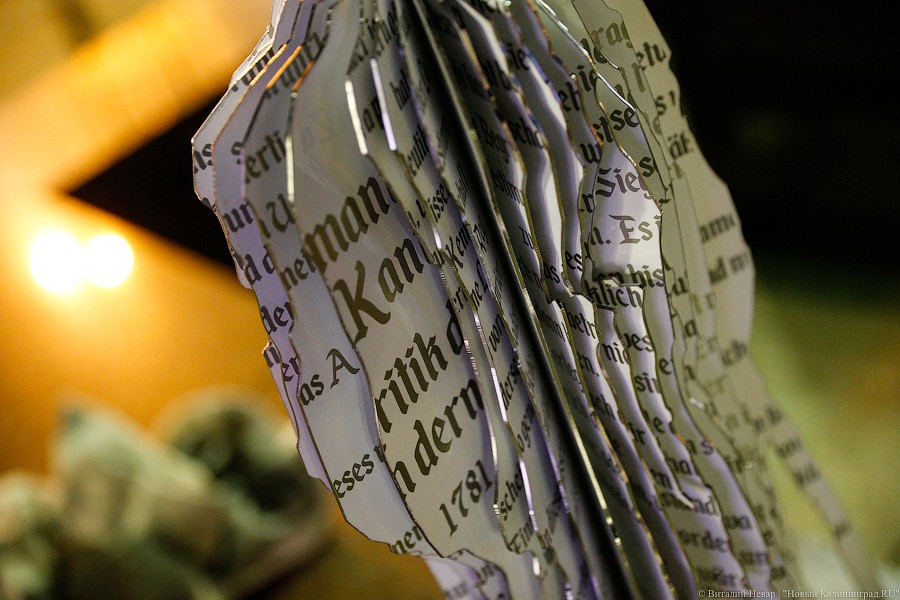 Причем обратился в прямом смысле: фигура составлена и вырезана из окрашенных металлических пластин, имитирующих книжные страницы — так же было и с Достоевским. На пластинах отображен текст из «Критики чистого разума» на немецком языке; страницы якобы обгорели. Высота скульптуры — меньше метра, в одном из своих интервью Василий Клюкин рассказывал, что выбрал этот формат для того, чтобы не проходить многочисленные согласования с городскими властями. Калининграду, как и Омску, он свою работу подарил.