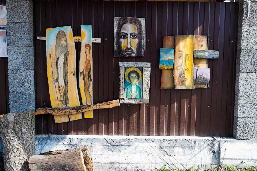 Валерий Романенко успел нарисовать немалое количество картин на самые разные сюжеты. Пройдя вдоль того самого забора, на котором развешаны его работы, можно увидеть фантазийные закаты, тесные улочки выдуманных городов, натюрморты из квадратных яблок, намёки на иконопись, одуванчик, белая «шапка» которого остроумно сделана из простой резинки