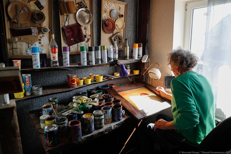 Теперь под мастерскую переоборудована небольшая комната. Рабочий стол там удобно располагается у окна, над столом — приколоченные к стене полки из необработанного дерева, куча банок, кистей, других необходимых для творчества «примочек». Ещё выше на стене — тоже столы, точнее, инсталляции на их тему — прибитые к стене деревянные «подносы» с самыми разными житейскими мелочами. Вот стол, за которым будто бы намеревается обедать деловой мужчина. На нём кожаный бумажник, смятые банкноты, чашка для кофе и разбросанные визитки. Вот стол