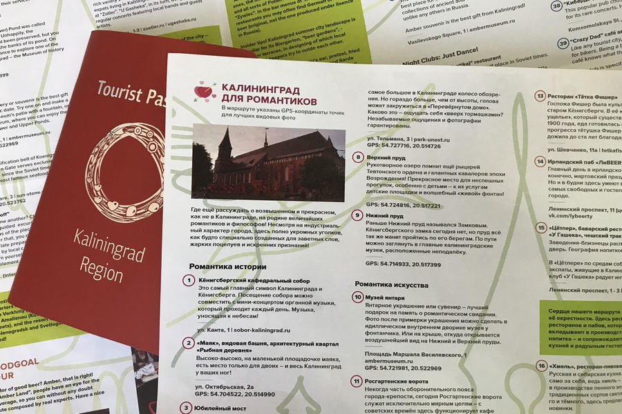 Например, в маршрут «Калининград для романтиков» (финальное название тех самых «мест для поцелуев») на расширенном варианте карты вошли следующие точки: Кафедральный собор, Рыбная деревня, Юбилейный мост, Эстакадный мост, Музей Мирового океана, Ботанический сад, парк «Юность», Верхнее озеро, Нижний пруд, Музей янтаря, Росгартенские ворота и форт «Дёнхофф». Идти пешком от центра города до 11 форта — удовольствие сомнительное.