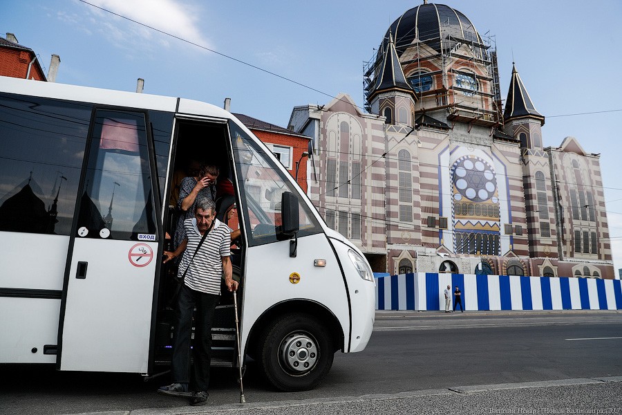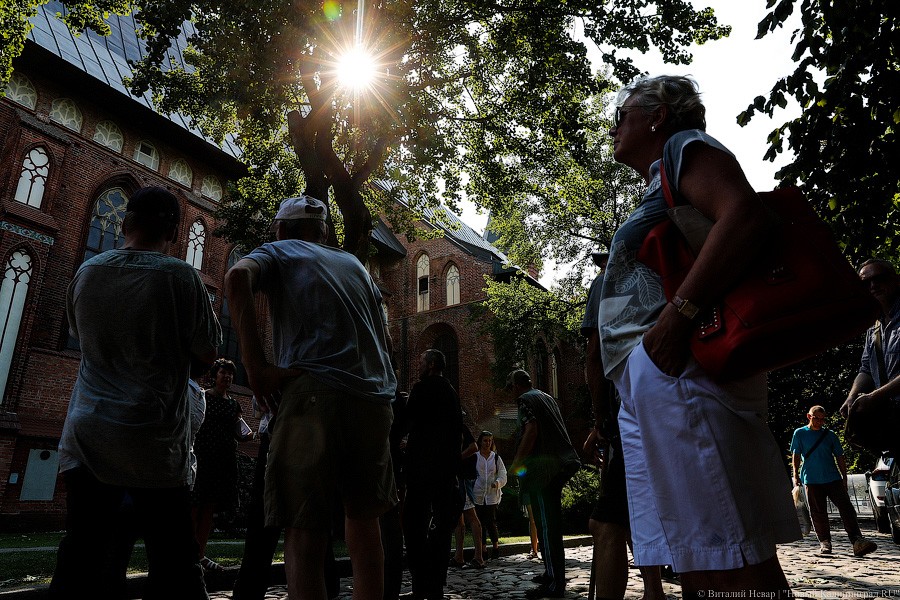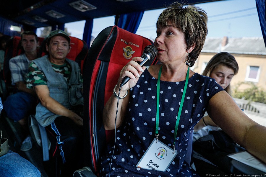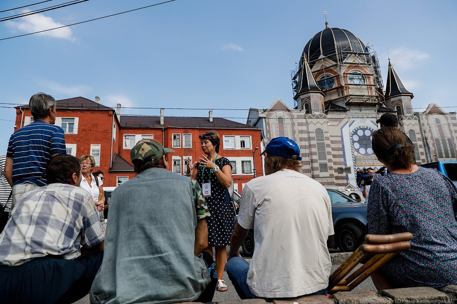 Первая экскурсия пробная и обзорная — смотрим из окон на «Вагонку» (кто-то с задних рядов говорит, что там еще был), на виллы, проезжаем кирху королевы Луизы, кинотеатр «Заря» (в него, естественно, тоже когда-токто-то ходил), потом фонтан с зубрами, потом площадь, потом на остановке в автобус подсаживается еще четыре экскурсанта и путь продолжается. Жарко, душно, экскурсовод Оксана периодически спрашивает, всем ли слышно и все ли в порядке — ей отвечают, что да. Когда она спрашивает, что было бы интересно посмотреть, экскурсанты отвечают, что обязательно зоопарк и стадион. Зоопарк решаем оставить на следующий раз, на стадион смотрим со второй эстакады, часть народу просит подъехать поближе или выйти. Им справедливо отвечают, что, во-первых, тут тоже вид очень красивый, во-вторых, с маломобильными товарищами пешая прогулка вокруг стадиона будет непростой.