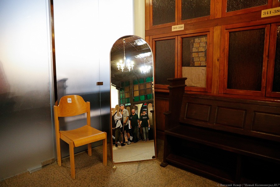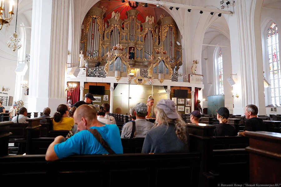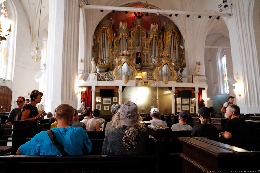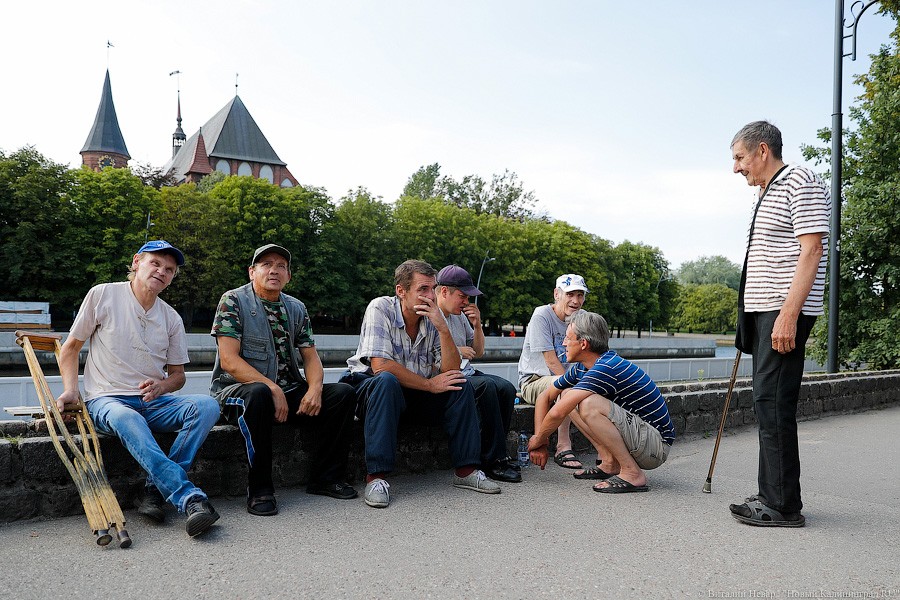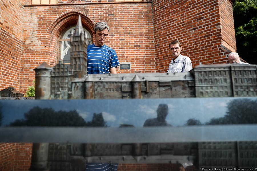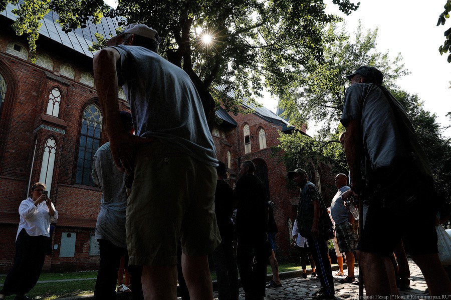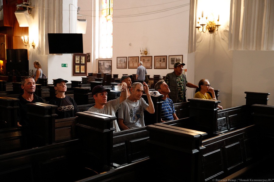 После фонтана все едут к Кафедральному собору. В плане — экскурсия и репетиция органного концерта. Около собора тот невысокий и улыбчивый мужчина на костылях говорит, что здесь впервые за пятнадцать лет. Потом поясняет, что в прошлой жизни был одним из тех мастеров, которые делали у собора кровлю. Другой мужчина задирает голову и говорит, что помнит, как шпиль делали на его заводе. О прошлой жизни говорят коротко, она вот так проскальзывает в брошенных фразах. Внутри собора все ведут себя тихо, ходят по органному залу, все осматривают, фотографируют. Активнее всех ведет себя Наташа: она находит самые «зачетные» места для снимков. В какой-то момент она просит: «А снимите меня с Костей» и кокетливо замирает. Костя стягивает футболку. Репетиция органа отменяется, вместо нее — репетиция на терменвоксе. Все немного расстроены и выходят на улицу. Идем к могиле Канта — там запланировано чаепитие с пирогами. Двое уже изрядно постаревших мужчин поглядывают на металлическую пушку около Собора. «Да не особо ценная, так лежит, не из бронзы. Эдик, будь она бронзовая — мы с тобой бы богачами стали!» — говорит один другому. Маша вмешивается в разговор: «Зачем, почему именно бронзовая вам нужна?» «Маш, ты чего, перегрелась?!» — оба добродушно смеются, один кивает на пушку и делает характерный щелчок пальцами у горла.