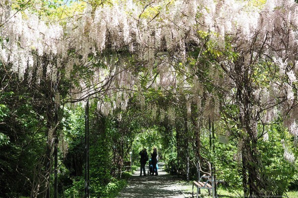 В Ботаническому саду — разгар цветения. Особенно ярко в этом году распустилась глициния флорибунда — лиана с махровыми фиолетовыми гроздьями цветов. «Первый раз за свою жизнь она цветёт так пышно», — отмечают сотрудники Ботанического сада. Учреждение уже перешло на летнее расписание. До августа в саду можно гулять с 10:00 до 20:00. Только будьте внимательны — касса закрывается в 19:00, в это же время прекращается вход на территорию.