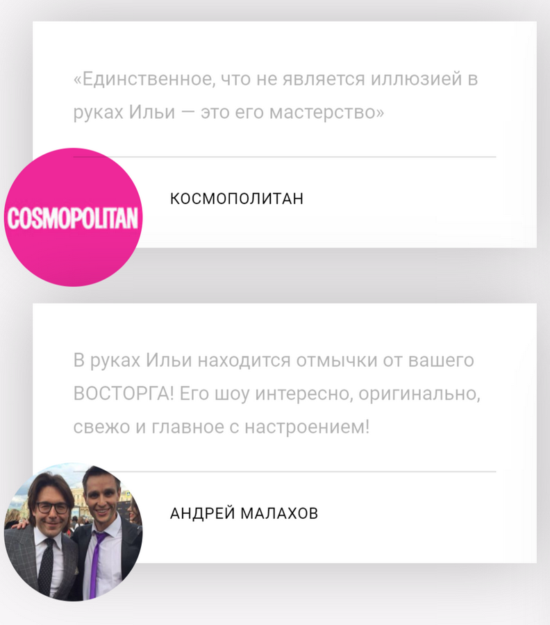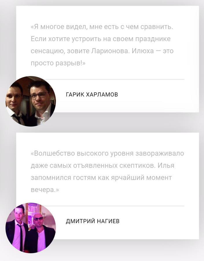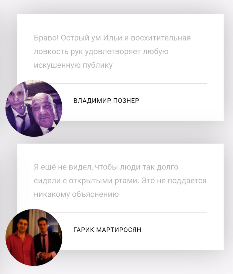 Илья Ларионов — профессиональный фокусник, мастер иллюзий, ведущий проектов «Школа волшебства», «Фактор WoW», менталист. Создатель авторского обучающего проекта и популяризатор иллюзионного жанра. Обладатель премии «Артист года в оригинальном жанре».