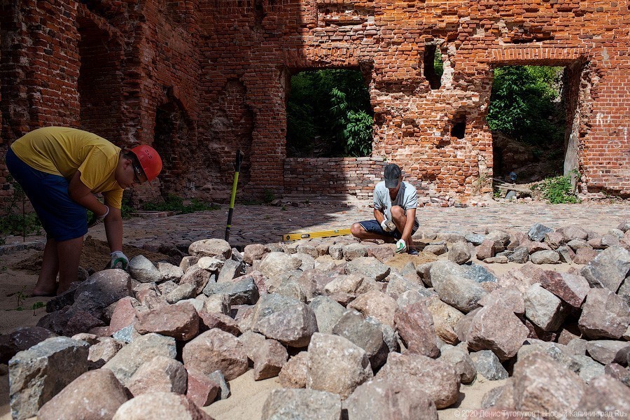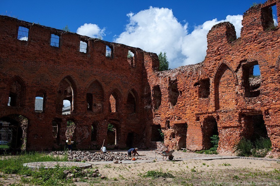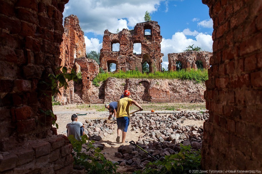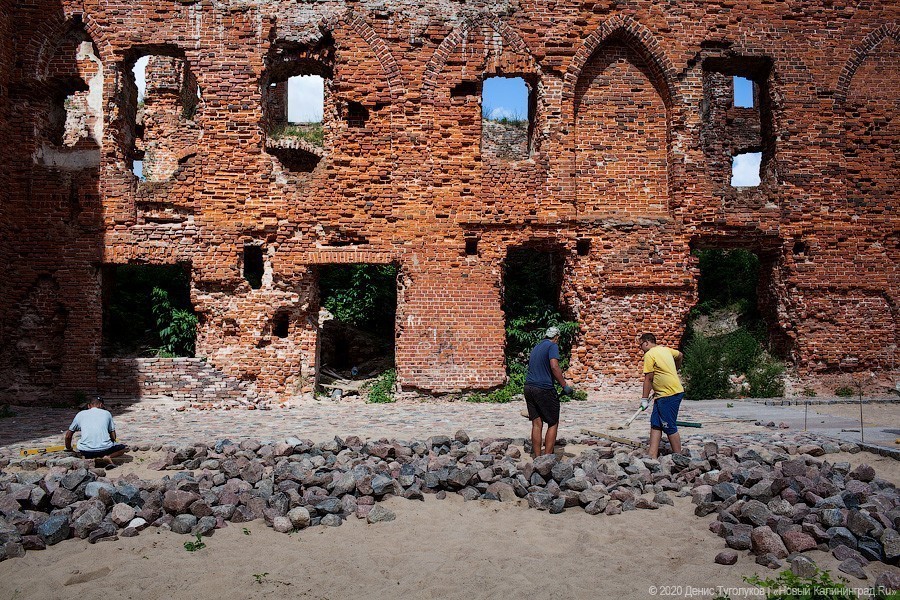 Первым делом Рагнит очистили от многолетнего мусора и дёрна. К уборке привлекли не только наёмных рабочих, но и волонтёров. «Они работают по-настоящему, — поясняет Евгений Гульник. — Есть волонтёры, приезжающие регулярно. Ещё и инвентарь привозят с собой в подарок. Это люди, которым небезразличны история и сохранение архитектурных памятников. На субботники приходит молодёжь и люди постарше, местные и приезжие, одиночки и целые организации — формальные и неформальные. Очищают двор, разгребают подвалы, вывозят грунт — очень нам помогают». Сейчас рабочие мостят внутренний двор замка. Часть брусчатки обнаружили прямо здесь, в Рагните. По старым чертежам, которые предоставил Государственный архив Калининградской области, в замке расчищают подвалы. «Это сильно облегчает нам жизнь, — говорит Евгений Гульник. — Переделок было очень много — и немецких, и советских. Люди занимали подвалы для личных нужд, делили площади, закладывали стены. По старым чертежам мы продвигаемся от кладки к кладке, взламываем стену и двигаемся дальше». В подвалы уже можно ненадолго спуститься с экскурсией, а в будущем есть идея обустроить в них пивоварню или, например, сувенирную лавку.