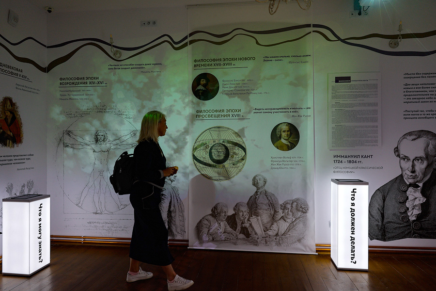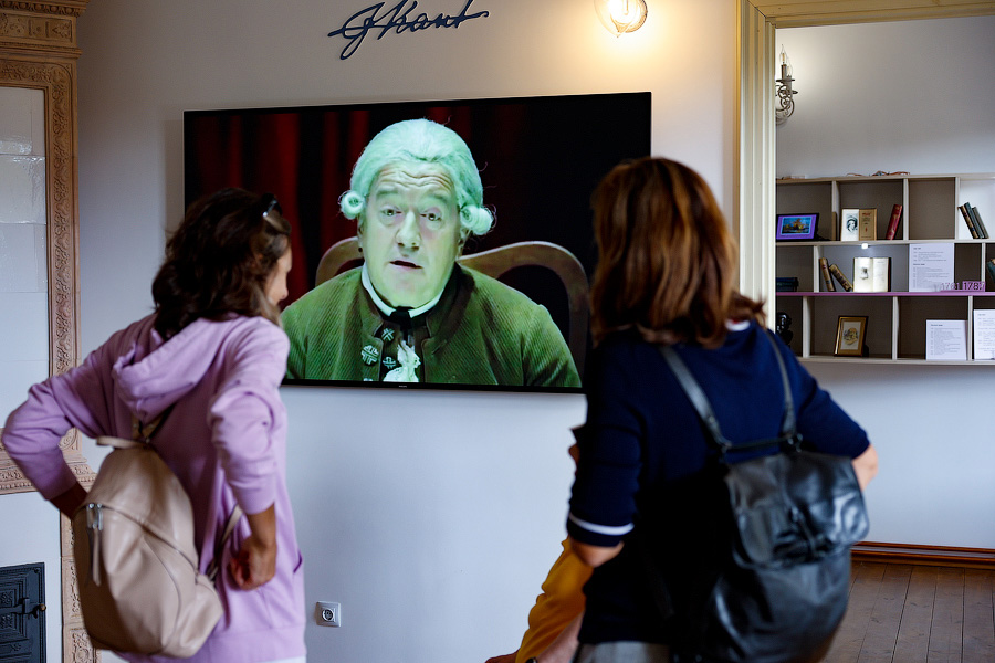 Новая экспозиция тонко переплетает историю с современностью. Кухня пасторского дома заставлена старинной утварью, но огонь в печи уже не греет — от него осталось только цифровое изображение. Прежних жителей можно увидеть разве что в качестве проекций. В кабинете пастора лежит Библия XVIII века, а прямо за ней во всю стену мелькают изображения ещё существующих и уже почивших фресок в кирхах Калининградской области. На экране в комнате с пианино показывают спектакль «Кант» Театра Маяковского. С помощью интерактивных экранов можно узнать, например, о реформах образования в Пруссии или о домашних школах Германии. А в каждом зеркале (и заодно в каждом госте) здесь отражается Иммануил Кант.