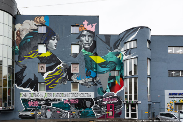 На фасаде торгового дома на Ленинском проспекте, 7-9 (старая «Европа») нарисовали мурал с женщинами-птицами. Авторами проекта стали художники Fault Studio.