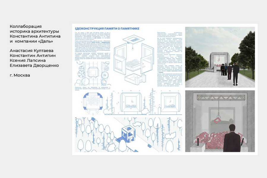 Победителем стал совместный проект «(Де)конструкция памяти о памятнике» московских авторов: историка архитектуры Константина Антипина и группы «Даль», в которую также входят Анастасия Култаева, Ксения Лапсина и Елизавета Дворщенко. Авторы получат приз в 100 тысяч рублей.