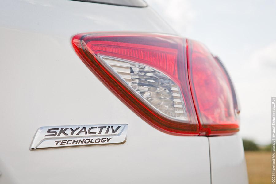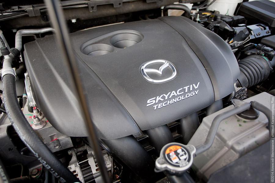 Под нашим капотом оказывается мощный 2,5-литровый бензиновый атмосферник, построенный японскими инженерами с использованием технологий SkyActive. Самое невероятное в нем — степень сжатия — 14:1! Просто сравните: у болидов «Формулы-1» это отношение редко превышает 12:1. 14:1 на гражданском моторе? Да его же разорвать должно от детонации! Но… не разрывает. Зато позволяет значительно улучшить эффективность за счет большей экономичности и лучшей тяговитости, говорят японцы.