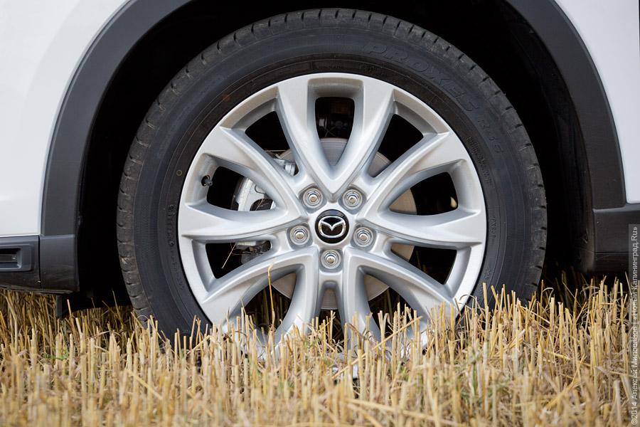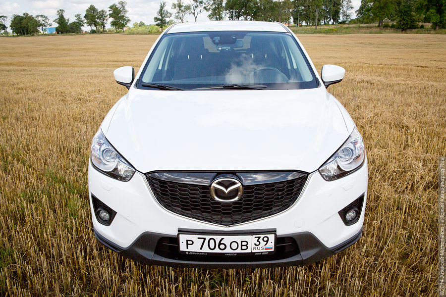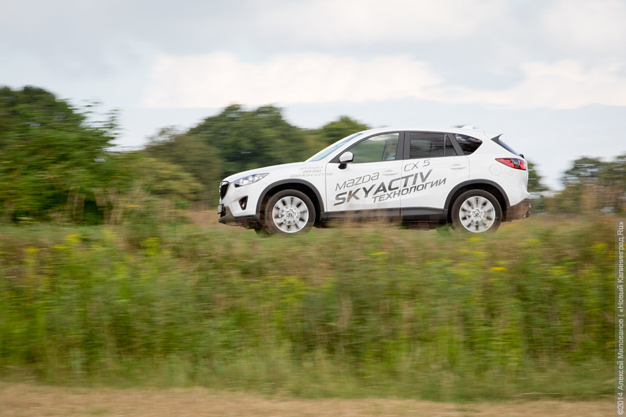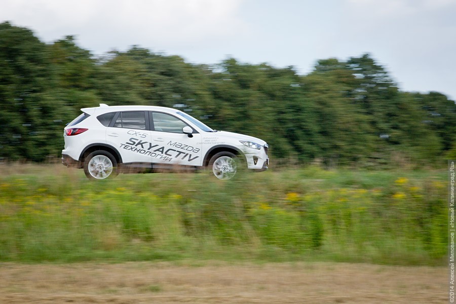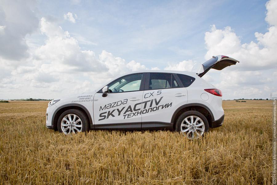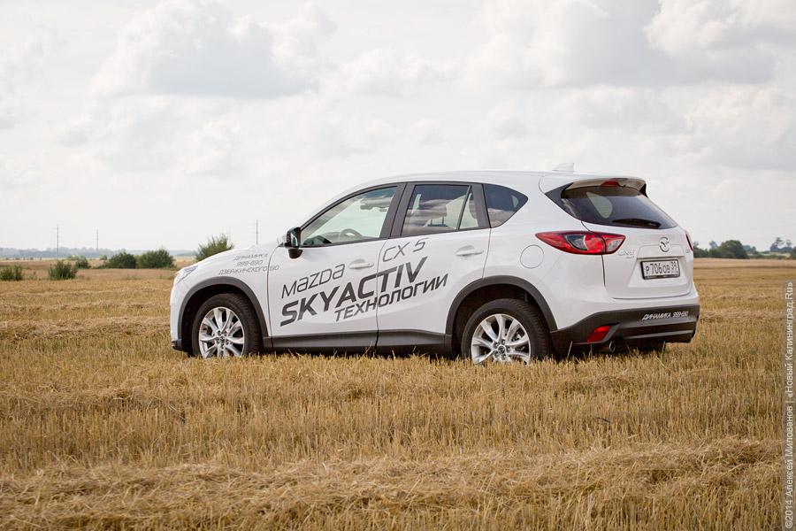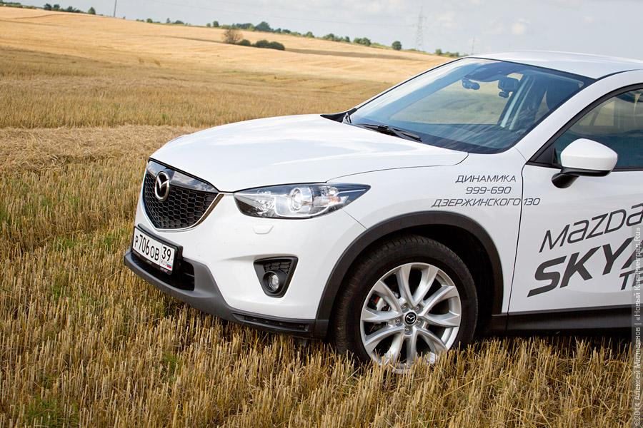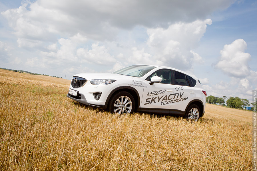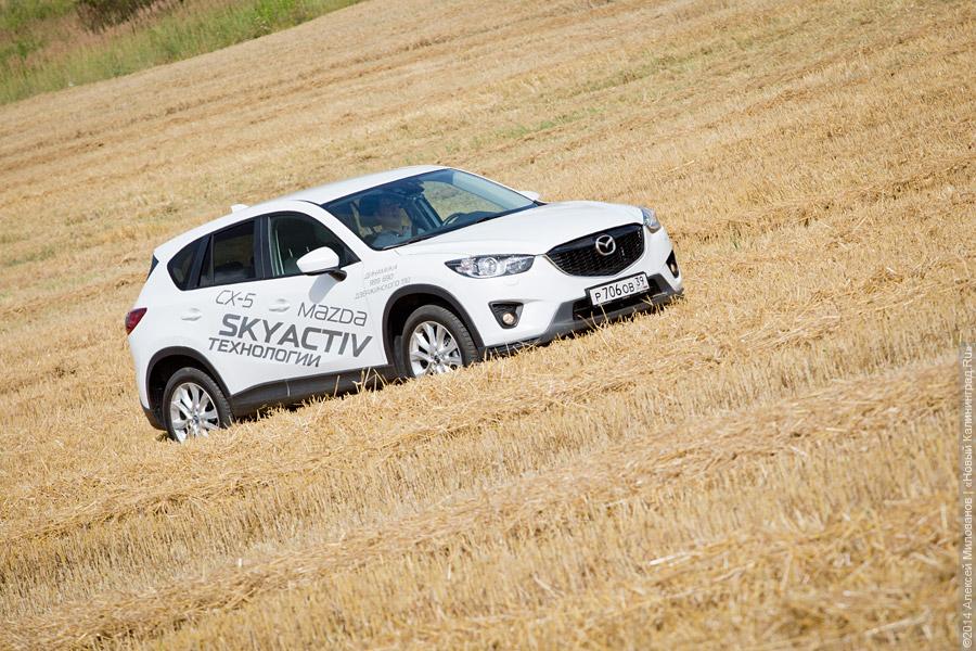 При этом Mazda CX-5 — все ещё японский автомобиль, а значит везет пассажиров мягко, с комфортом, практически бесшумно проглатывая стыки и трещины на асфальте. Впрочем, подобные особенности национальных русских дорог для кроссовера — сущие пустяки. Вот поле — другое дело. Да, сворачивать с твердого покрытия на «паркетнике» прямо в раскисшую от дождей глину, несмотря на полный привод, было бы сродни самоубийству, но атмосферные осадки этим летом в нашей области — явление нечастое, а по сухой, пусть и сильно неровной поверхности CX-5 способен ехать не хуже, чем комбайн: клиренс в 210 мм позволяет.