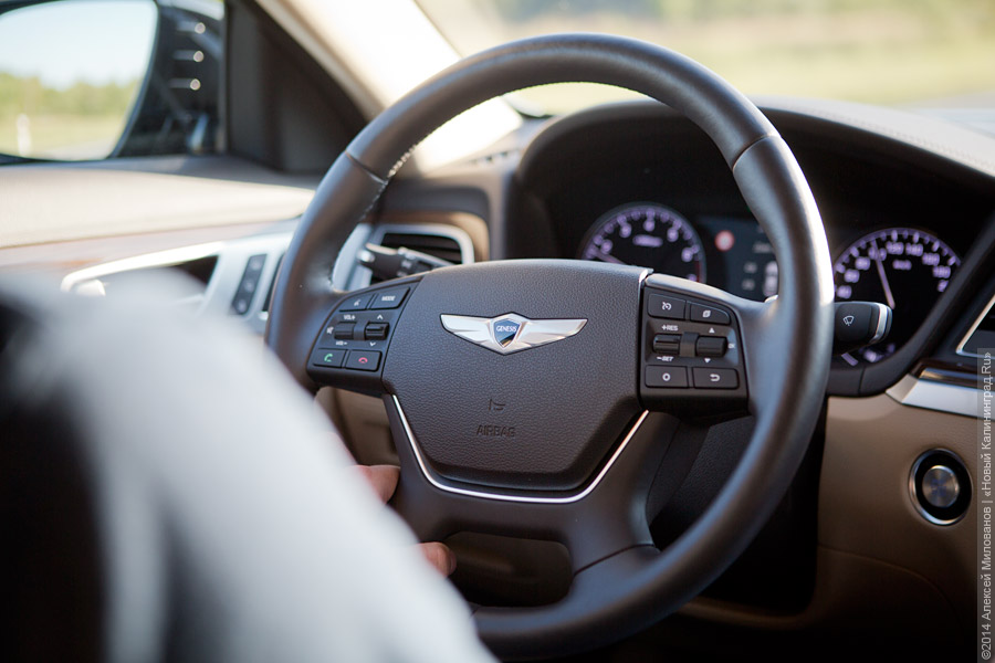 Но как бы ни хотелось посильнее нажать на педаль акселератора, приходится сдерживать свои желания — сзади на хвосте висит еще один Genesis, но в максимальной комплектации, с директором автосалона «Динамика» (официального дилера Hyundai в Калининграде) за рулем. Благородный, хотя и сильно приглушенный шумоизоляцией звук работающей «шестерки» из подкапотного пространства слышен в салоне лишь в редкие моменты обгона пустых фур и немногочисленных легковых машин, движущихся этим вечером в сторону Польши.