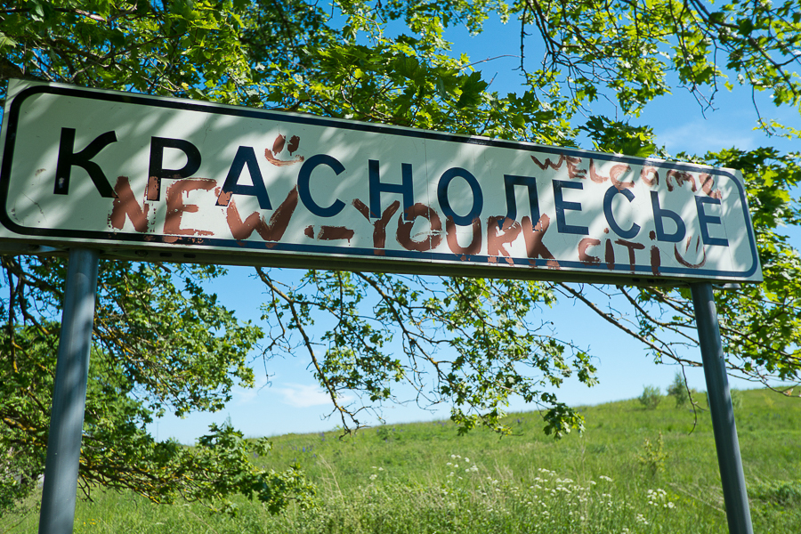 До конца пути, тем временем, оставалось 35 километров. Времени — в обрез: ещё чуть-чуть, и перспектива пропустить концерт оказалась бы вполне реальной. Пришлось поднажать, не жалея сил. Мы мчались через ухоженные поля, на которых паслись чёрные коровы, холмы и горки, не считая их количество — было уже не до этого. За три километра до Краснолесья кончилась асфальтовая дорога. Мы, тем не менее, жали на педали что было мочи. Так, что почти пропустили краснолесненский знак, который помимо своей прямой по назначению надписи был украшен словами «Welcome New-Yourk Citi» и двумя смайлами. Памятное селфи у таблички. До начала концерта — 15 минут. Сделано — мы доехали.