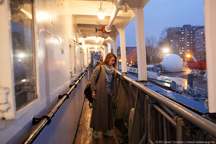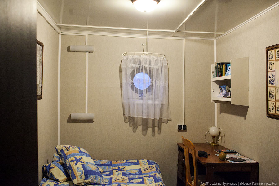 На палубе группа туристов. В рубке сидит как бы штурман Денис. Он записывает паспортные данные постояльца, выдает два комплекта ключей — один от номера, второй, магнитный, от ворот на территорию музея. Это на тот случай, если мне захочется погулять и обратно я вернусь после семи вечера. Денис же провожает нас к каюте. Все очень мило, и складывается ощущение, что встречают здесь не незнакомых людей, которые приехали на одну ночь, а старых приятелей.