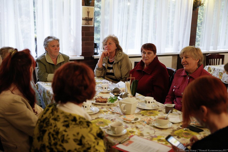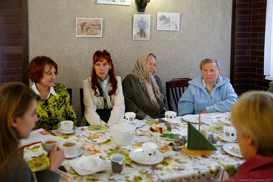 Татьяна Александровна, жительница поселка Морское, она сидит во главе стола в застегнутой серой куртке. Рядом с ней по левую руку в голубой кофте сидит Лизавета, затем в платке и сером плаще — Таисия Федоровна, женщина с длинными волосами и в светлой куртке — ее дочь Алла. Все — жительницы поселка Морское, кроме Аллы — она с шестнадцати лет живет в Калининграде.