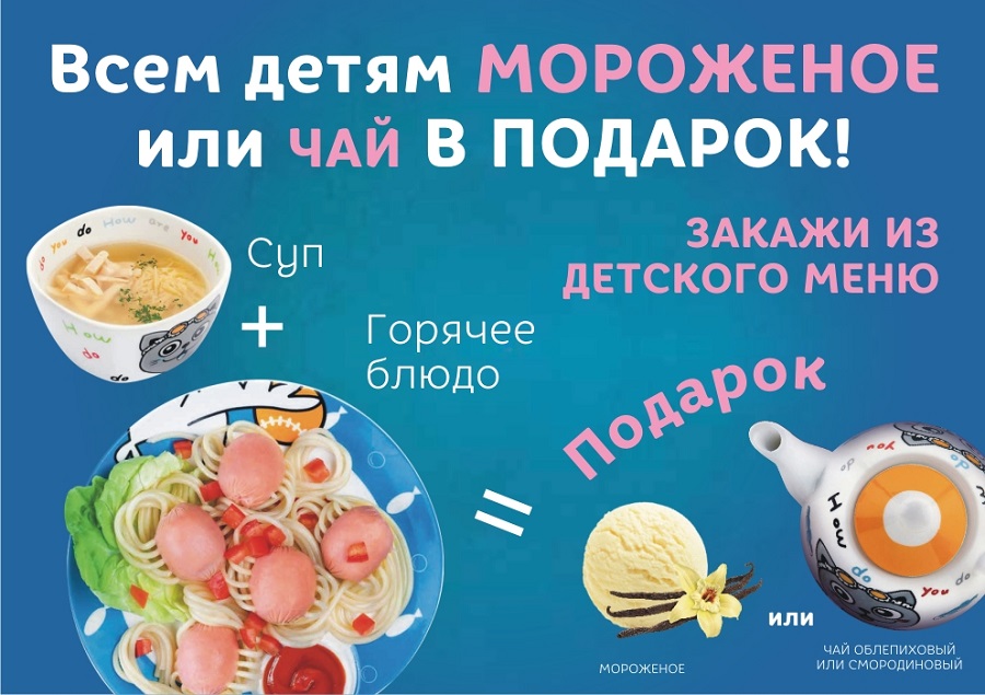 А у нас действует отличная акция для самых маленьких гурманов! При заказе супчика и горячего блюда из детского меню в подарок мороженое или натуральный чай (смородиновый или облепиховый).