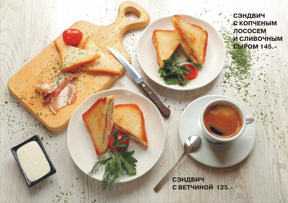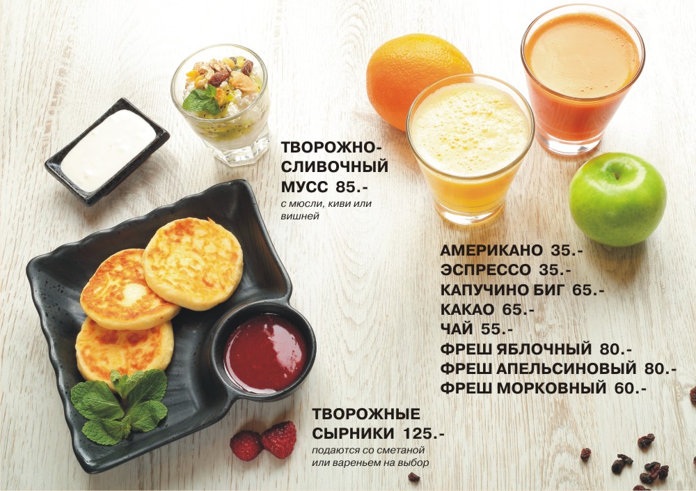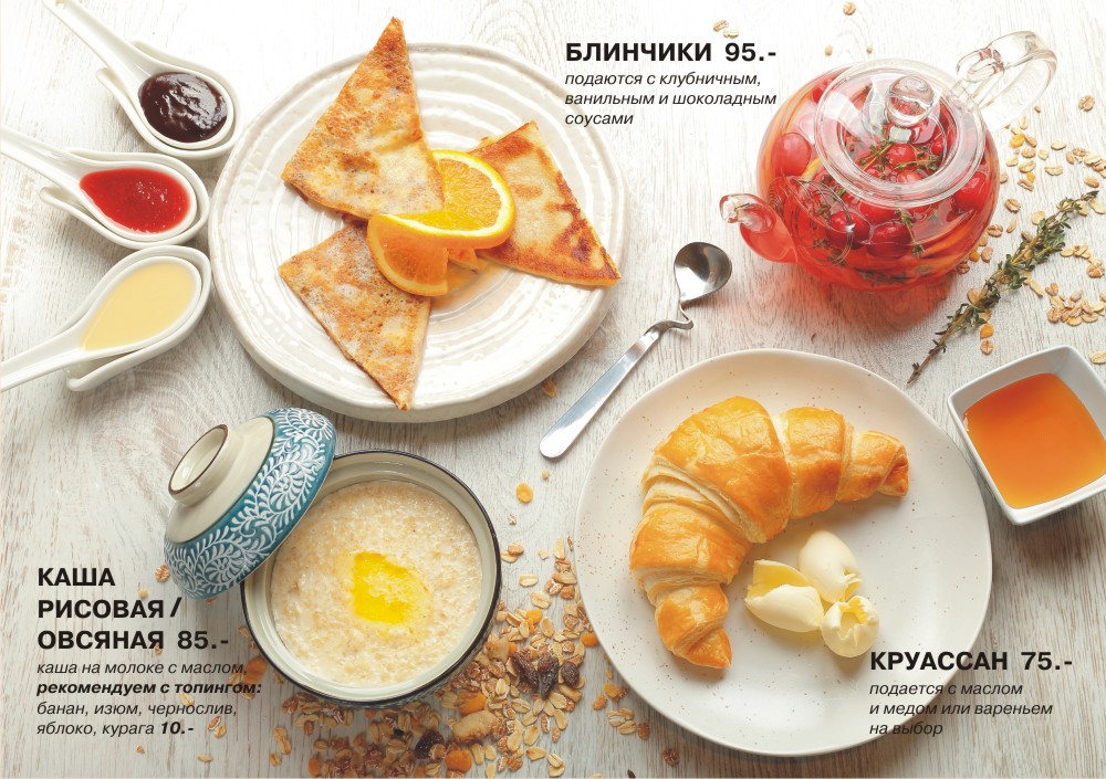 Всегда на ваш выбор: круассан с маслом и джемом, блинчики с соусами, омлеты и сандвичи, наваристые каши, тёплые роллы, а так же ароматный чай, кофе по специальное цене.