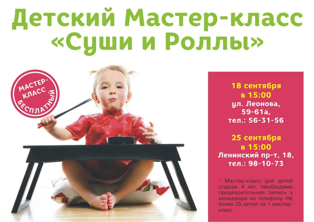 Ваш ребенок познакомится с богатой историей японской кухни, узнает много интересного о традициях и обычаях этой страны и сможет попробовать себя в роли сусиста под руководством нашего повара, приготовив вкуснейший ролл.