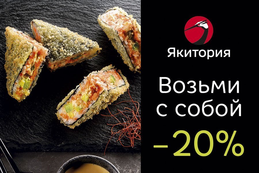 Воспользуйтесь акцией «Возьми с собой — 20% скидка». При заказе с собой любых блюд из меню в кафе «Якитория» предоставляется скидка 20%. Быстро, вкусно и недорого!