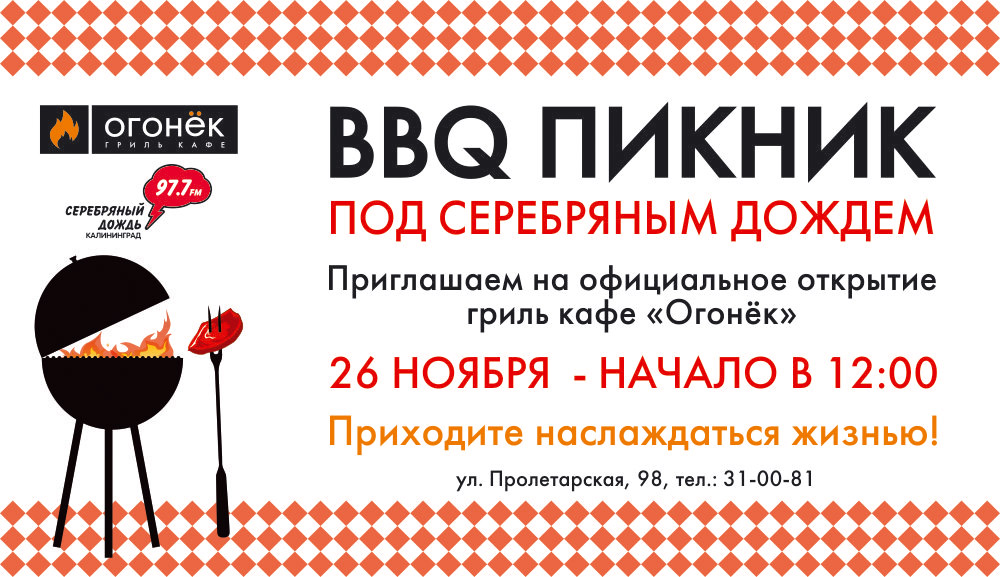 Гриль-кафе «Огонек» и радио «Серебряный дождь» приглашают вас на BBQ-пикник на набережную Верхнего озера 26 ноября в 12:00!