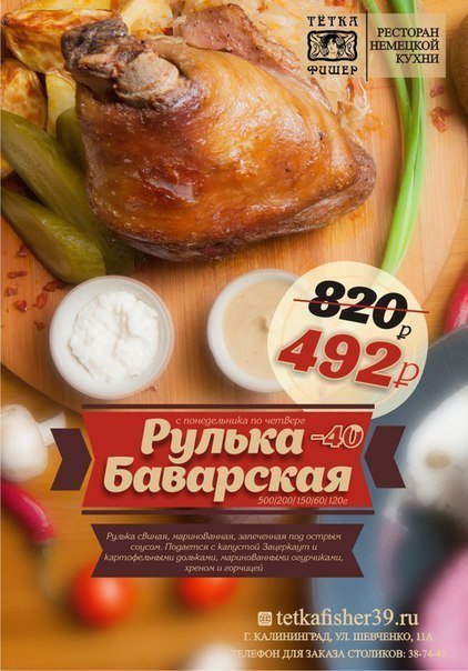 Попробуйте настоящую баварскую рульку в ресторане «Тетка Фишер» со скидкой 40%. С понедельника по четверг ждем вас попробовать вкусное баварское блюдо.
