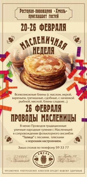 В меню проводов — традиционные уличные народные гуляния с Масленицей в сопровождении фольклорного ансамбля «Талица» с песнями, плясками и хорошим настроением.