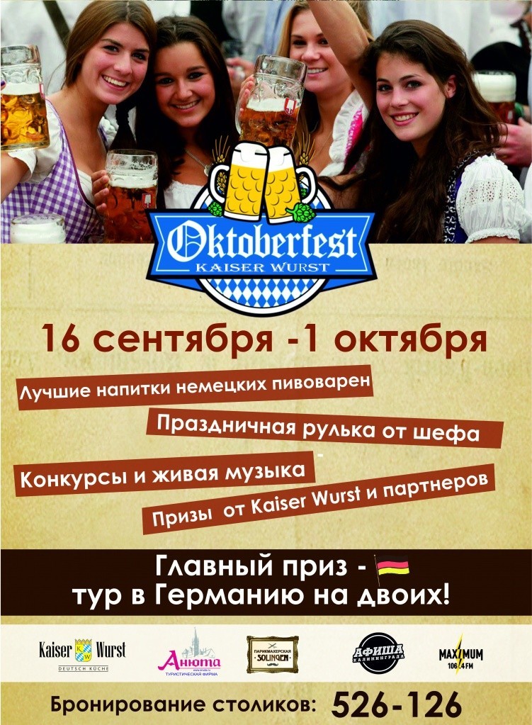 C 16 сентября по 1 октября в Калининграде пройдет «Октоберфест» — ежегодный Мюнхенский фестиваль пенных напитков. Место проведения — ресторан кёнигсбергской кухни «Kaiser Wurst» в ТЦ «Европа».