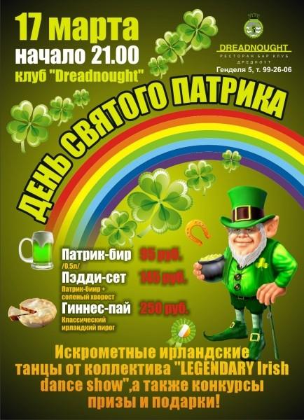 Ресторан «Дредноут», ул. Гендаля 5, тел 99-26-06Вас ждут искрометные ирландские танцы от коллектива "LEGENDARY Irish dance show" + море зелёного пива по специальной цене, конкурсы, призы и подарки от виски Телламор Дью! Начало в 21:00.