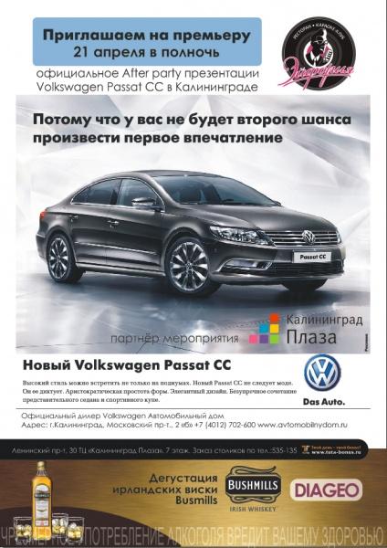 Многоуважаемые друзья! В субботу, 21 апреля Калининград сможет познакомиться с новым Volkswagen Passat CC! Ну а как только сумрак опустится на город мы приглашаем все вас, леди и джентельмены, обсудить увиденное в караоке-клуб "Эйфория"! Безусловно, беседы о возвышенном льются плавнее после дегустации благородных напитков. Компания DIAGIO и торговая марка BUSHMILLS любезно угостят Вас легендарными напитками ирландских вискокурен.