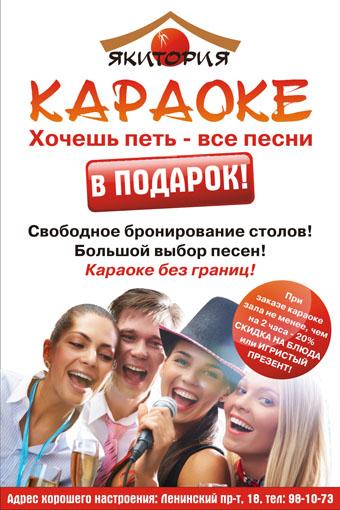 Где можно попеть от души? Где можно блеснуть своим певческим талантом? Где можно во весь голос спеть любимые шедевры, обнявшись с друзьями, или блестящим соло исполнить сложную композицию, затмив эстрадного певца? Добро пожаловать в караоке-зал кафе «Якитория» Ленинский пр-т 18! В кафе выделен специальный зал на 20 посадочных мест, оборудованный всем необходимым для караоке!