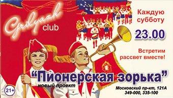 Каждую субботу для Вас, Ваших друзей, родных, коллег и близких в клубе "Грильяж" резидент клуба Диск-Жокей Иван Пионеров представляет проект "Пионерская Зорька".