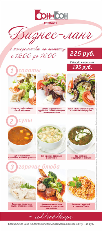 Специальная цена на дополнительные напитки к бизнес-ланчу — 45 рублей.