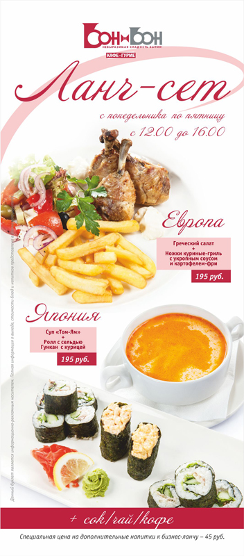 С 8 апреля Ланч-сет по 195 рублей.