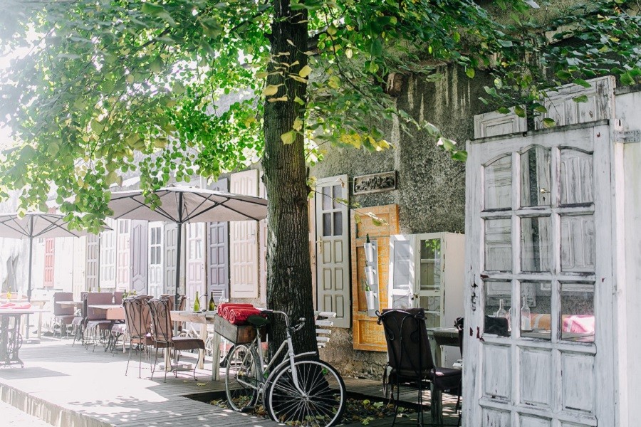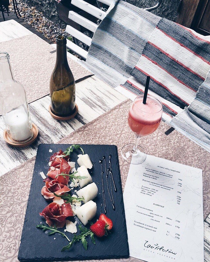 Наша терраса сохранила старую липу, крона которой дарит прохладу в жаркий день и нашептывает листвой мелодии весны и лета, прямо как у Чайковского во «Временах года». Деревянные столы, кованые спинки стульев, двери на стене — тот самый винтажный интерьер, который переносит нас в XIX век, время, когда творил Чайковский.