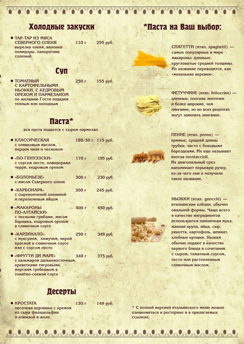 Ресторан-пивоварня «Хмель» представляет гастрономическую повесть «Иностранцы в России». Глава первая — об истории итальянцев в Сибири и кулинарной фантазии на тему традиционных итальянских блюд из сибирских продуктов. Специальное меню «Итальянцы в Сибири» в ресторане «Хмель» с