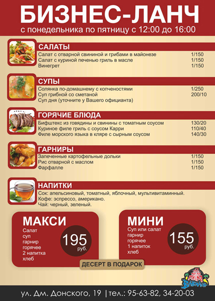 Макси-ланч — 195 рублей (салат, первое блюдо, горячее блюдо, гарнир, хлеб, сок и горячий напиток на ваш выбор).