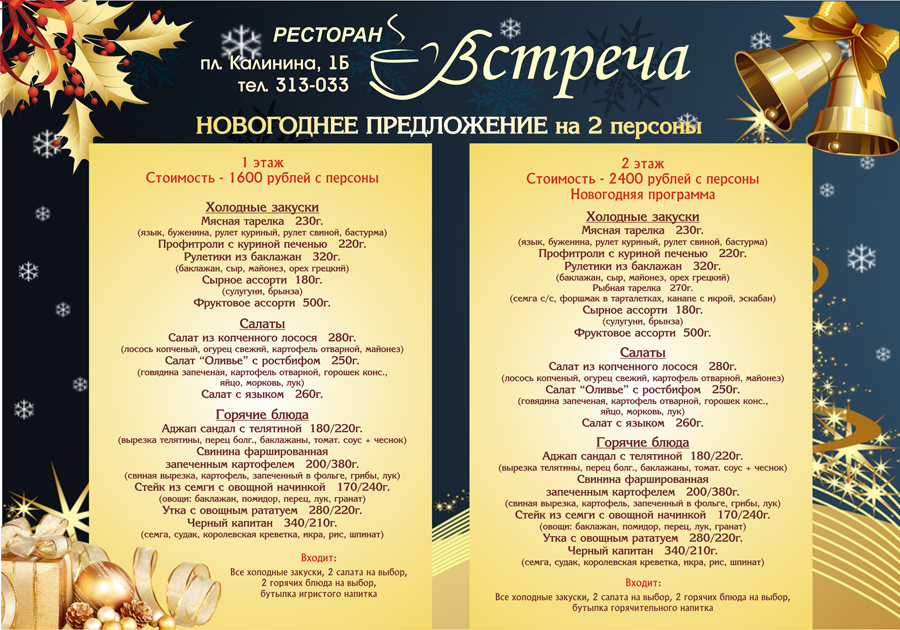 Мы рады предложить нашим гостям вкусные блюда, а отзывчивый персонал всегда готов прийти на помощь и сделать ваше пребывание в нашем ресторане максимально комфортным. Ресторан «Встреча» приглашает провести новогодний корпоратив, а также встретить Новый год в уютной атмосфере и душевной компании. Мы приготовили специальное новогоднее меню!