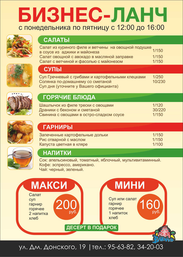 Макси-ланч — 200 рублей (салат, первое блюдо, горячее блюдо, гарнир, хлеб, сок и горячий напиток на ваш выбор и десерт в подарок)
