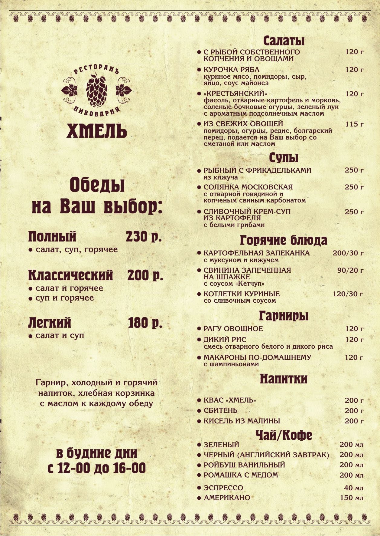 «Полный» — 230 руб., «Классический» — 200 руб., «Легкий» — 180 руб.