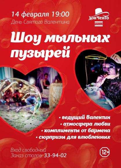 Хотите подарить своей второй половинке незабываемый вечер в День всех влюбленных? Приходите в пиццерию «Дон Ченто» на ул. 9 Апреля. Здесь 14 февраля вас ждет атмосфера любви с вкусными комплиментами от бармена и сюрпризами для влюбленных. Подарком вечера для всех гостей станет шоу мыльных пузырей. Это поистине захватывающее представление уже полюбилось многим калининградцам. Вы должны это увидеть! Ждем вас 14 февраля в 19:00. Советуем заранее бронировать столики по телефону: