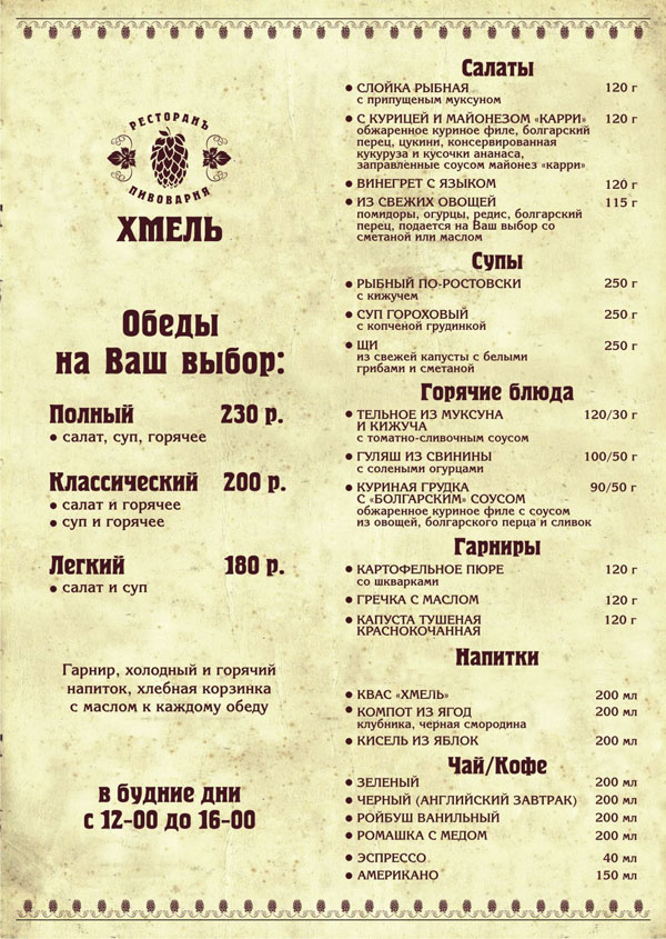 «Полный» — 230 руб., «Классический» — 200 руб., «Легкий» — 180 руб.