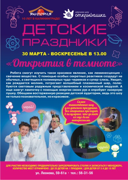 Открытия в темноте! Таинственное шоу для детского праздника. Все открытия проходят в полумраке, что делает их еще более интересными.
