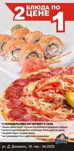 Закажите ваши любимые роллы или среднюю пиццу и получите второе блюдо в подарок.