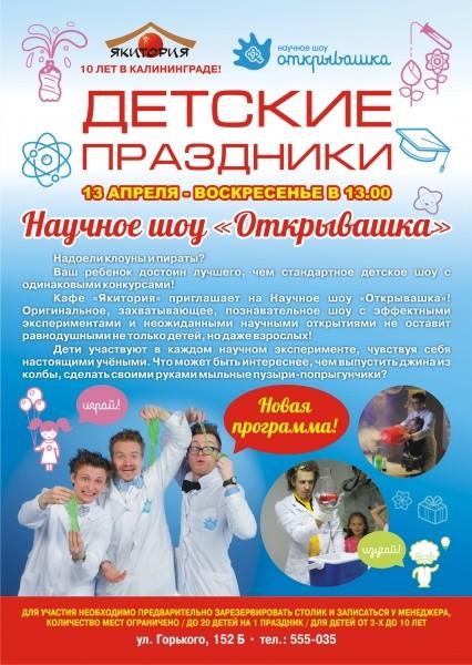 Кафе «Якитория» приглашает на новое научное шоу «Открывашка»! Оригинальное, захватывающее, познавательное шоу с эффектными экспериментами и неожиданными научными открытиями не оставит равнодушными не только детей, но даже взрослых!