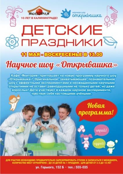 Оригинальное, захватывающее, познавательное шоу с эффективными экспериментами и неожиданными научными открытиями не оставят равнодушными не только детей, но даже взрослых! Дети участвуют в каждом научном эксперименте, чувствуя себя настоящими учеными.