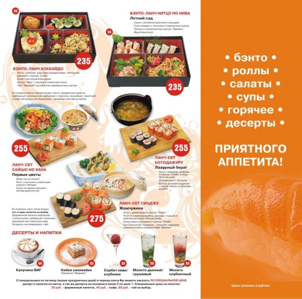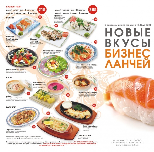 Вас ждут нежные роллы, сочные салаты со свежими овощами, разнообразные супы, в том числе освежающий холодный борщ и сытные горячие блюда. Плюс ко всему этому вы можете выбрать 2 напитка на ваш вкус. И всё это разнообразие от 170 руб.!