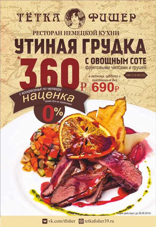 С воскресения по четверг мы приглашаем вас отведать восхитительные блюда заведения с наценкой 0%! В этот раз мы решили предложить вам нежнейшую утку с овощным соте по цене всего 360 руб. До встречи в ресторане!